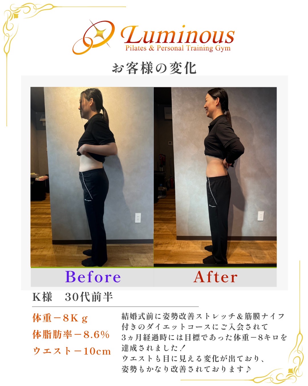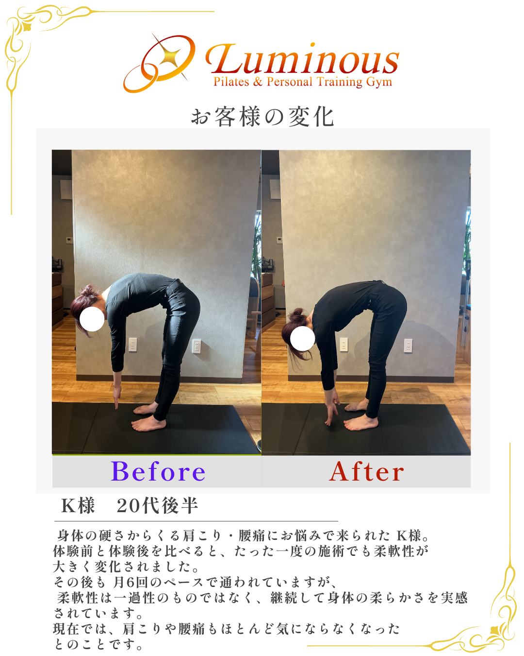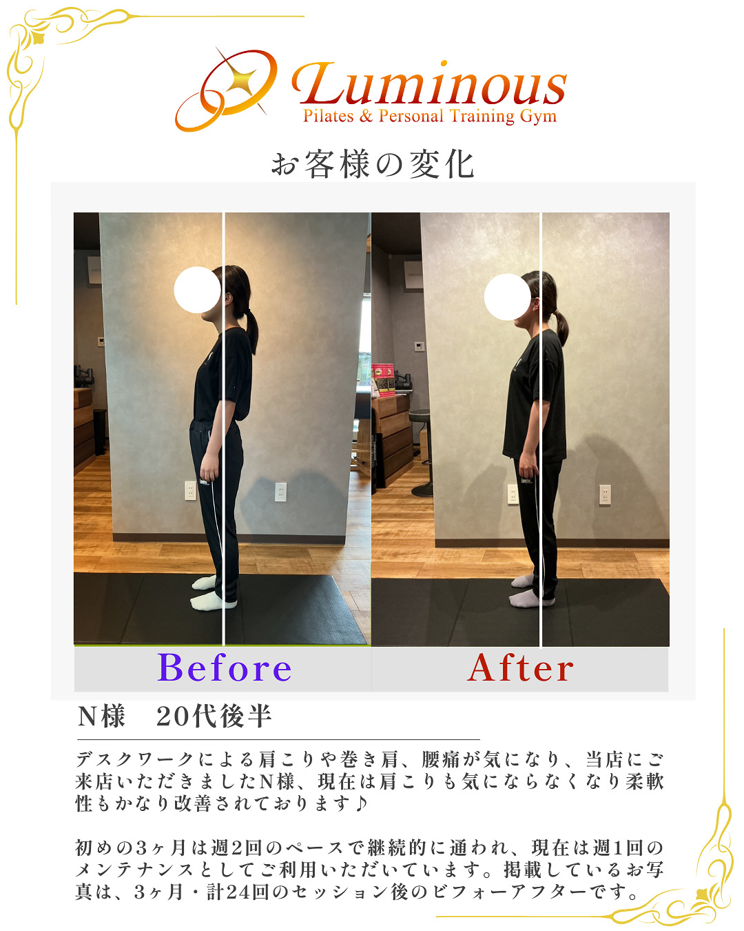 元々巻き肩の猫背な感じだったのですが、ピラティスと正しい姿勢での筋トレのおかげでかなり改善することができました。